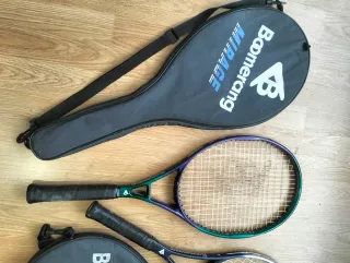 Se venden dos raquetas de tenis Boomerang, modelo Sapphire y Mirage, junto con sus fundas. - Raqueta Boomerang Sapphire. - Raqueta Boomerang Mirage. - Funda para raqueta Boomerang Sapphire. - Funda para raqueta Boomerang Mirage.