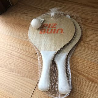 Juego de raquetas de playa Biz Bun, perfectas para disfrutar del verano. Son de madera y tienen mangos blancos. Incluye dos raquetas y una pelota. Están en buen estado y listas para usar. - Juego de 2 raquetas. - Incluye una pelota. - Mangos blancos. - De madera.