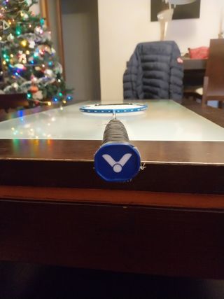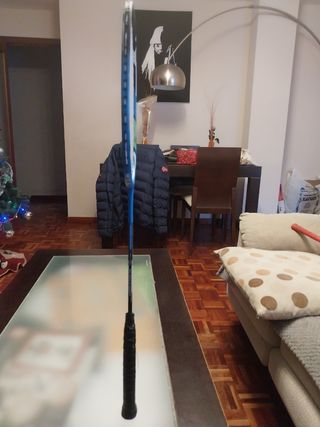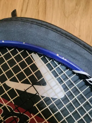 Raqueta de bádminton en buen estado, ideal para principiantes. Tiene algunos pequeños signos de uso, pero en general está en buenas condiciones. - Marca: aparentemente, Tecnifibre - Color: azul y blanco - Ideal para iniciarse en el bádminton