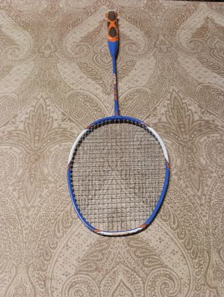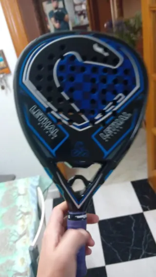 Raqueta usada, en buen estado estructural. El mango está desgastado, necesita cambiar el grip. Ideal para principiantes o para entrenar. - Marco de color azul. - Empuñadura azul con cinta de agarre.