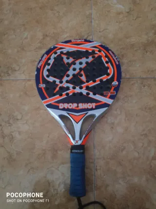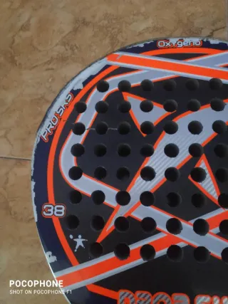 Raqueta de pádel Drop Shot Oxygeno Pro SRS con un peso de 38.tiene una pequeña raja esta en la foto dos. - Diseño con detalles en naranja y gris. - Superficie con agujeros. - Mango con grip azul.