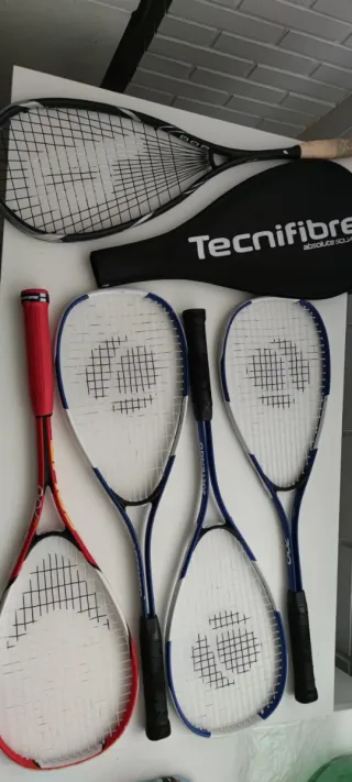 Se venden 5 raquetas de squash, una de ellas con funda. - Raquetas de squash. - Una incluye la funda original. - Los falta a todos poner la cinta del asidero.