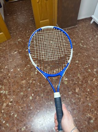 Raqueta de tenis junior de color azul. Ideal para niños pequeños que se inician. Solo hay que cambiarle el grip - Marco de color azul y blanco. - Empuñadura azul. - Cuerdas blancas y negras.