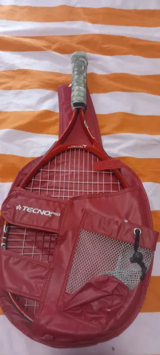 Raqueta de tenis de la marca Tecno Pro, de color rojo. - Incluye funda protectora. - Diseño deportivo.