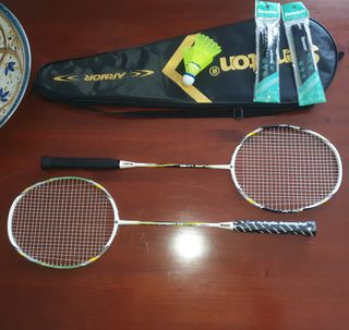 Set de 2 Raquetas de Bádminton, también incluye 2 volantes y 2 empuñaduras de recambio. Todo viene dentro de su funda, solo una de ellas está usada, la otra tiene hasta el protector de empuñadura Las vendo por desuso, compradas en Amazon por 40€