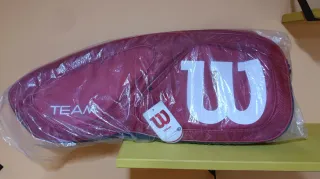 Raquetero Wilson en color rojo, completamente nuevo. - Diseño espacioso para equipamiento deportivo. - Logo grande de Wilson en blanco. - Etiqueta original Wilson incluida. - Capacidad hasta 6 raquetas.