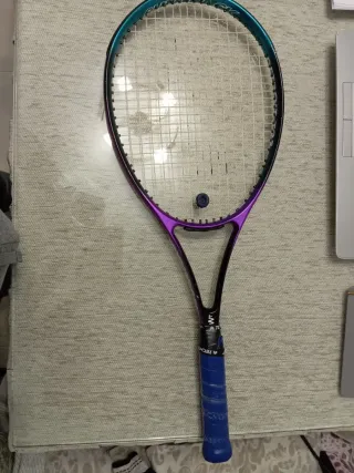 Raqueta de tenis con un diseño llamativo en azul y blanco. Lista para usar. Algo desgastada por los años pero totalmente funcional ( se ha probado su correcto funcionamiento de nuevo) - Talla niños - Marco de color azul y blanco. - Cuerdas blancas y tensadas correctamente Material naturalmente resistente y mango cómodo para evitar daños en la mano (handgrip totalmente cambiable) Perfecta para tus hijos/sobrinos/nietos... si estan empezando en este maravilloso deporte.