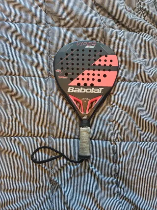 Raqueta de pádel Babolat con diseño moderno y llamativo. - Color principal azul con detalles en negro y naranja. - Superficie con agujeros para mejor aerodinámica. - Grip de tela para un mejor agarre. - Incluye cordón de seguridad.