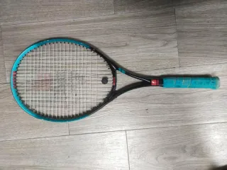 Raqueta de tenis de la marca Babolat. - Color azul y negro. - Empuñadura de color blanco desgastado es el original. Tensión de cuerdas 22 recién encordadas Peso de la raqueta 270