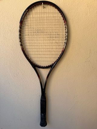 Dos raquetas de tenis de las marcas HEAD y YONEX. - Raqueta HEAD de color naranja y negro. - Raqueta YONEX de color rojo y negro. - Incluye un amuleto de Yin Yang en la raqueta YONEX.