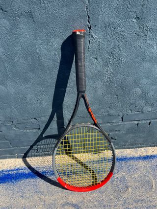 Raqueta de tenis de color rojo con detalles en negro y gris. - Marco de color rojo. - Empuñadura negra. - Cordaje gris.