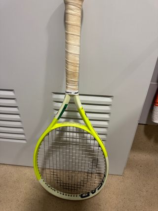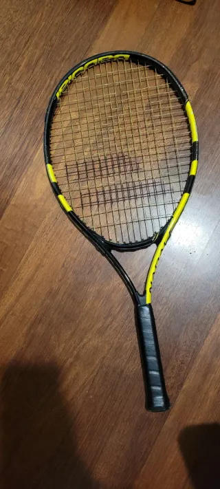 Raqueta de tenis Babolat, modelo Rafa Nadal. - Marco negro con detalles en amarillo. - Cuerdas de color amarillo. - Empuñadura negra.