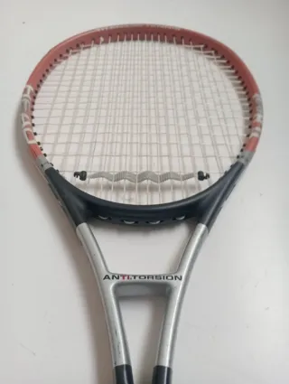 Raqueta de tenis con marco plateado y detalles en rojo. - Cuerdas negras. - Empuñadura negra.