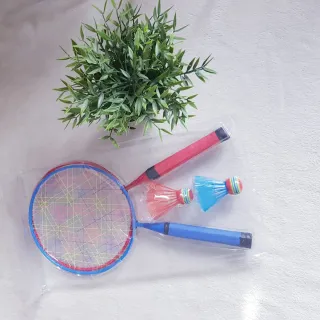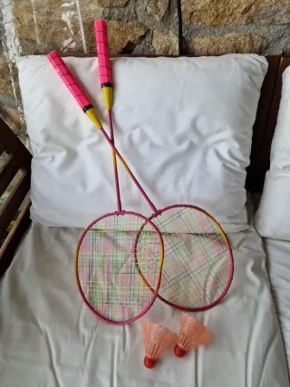 Set de bádminton con dos raquetas y tres volantes. - Raquetas con mangos de color rosa y amarillo. - Volantes de color naranja.