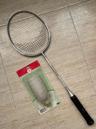 Set de bádminton con raqueta y volantes. - Raqueta usada de la marca Artengo. - Incluye 6 volantes de bádminton sin uso (quedan 6 de un envase de 9.