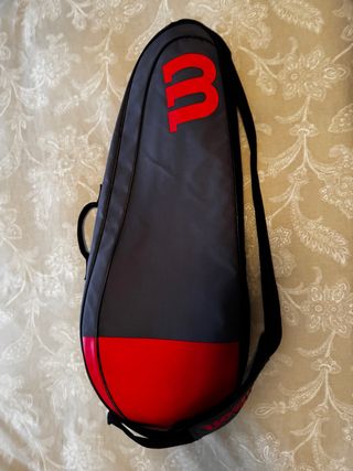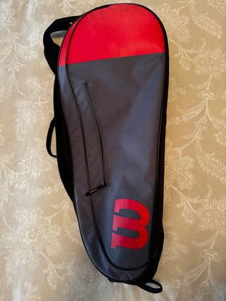 Raquetero de la marca Wilson, diseñado para transportar hasta tres raquetas de tenis. Cuenta con un asa para llevarlo cómodamente. - Color gris y rojo. - Logo de Wilson en color rojo.