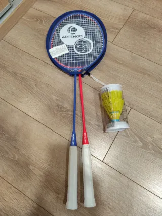 Set de dos raquetas de bádminton de la marca Artengo, ideal para iniciarse en el deporte. Incluye un tubo con volantes. - Raquetas con mangos blancos y varillas de colores azul y rojo. - Malla de bádminton azul. - Tubo con volantes amarillos.