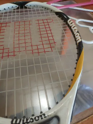 Raqueta de tenis Wilson. - Modelo US Open. - Marco blanco con detalles en negro y amarillo. - Empuñadura de cuero marrón.