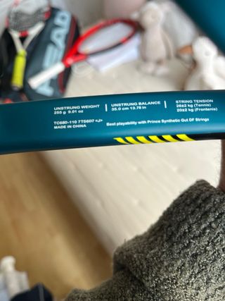 Raqueta de tenis con información de tensión de cuerda y patrón. - Tensión recomendada: 18+/-1kp / 38+/-2lbs - Patrón de cuerdas: 16 M / 19 C
