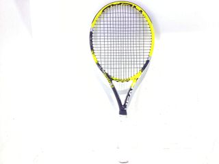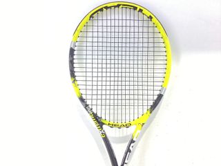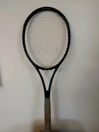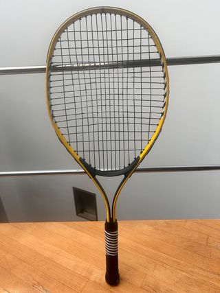 Raqueta de tenis con un diseño moderno y llamativo. - Marco negro con detalles en amarillo. - El mango es de mala calidad pero cumple su función perfectamente. - Tiene pequeños arañazos pero no tuvo mucho uso.