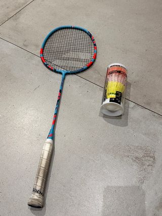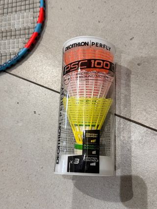 Set de bádminton con raqueta y plumas. - Raqueta de bádminton. - Tubo de plumas para bádminton.