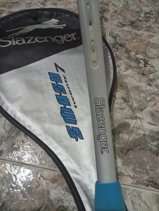 Raqueta de tenis Slazenger modelo Smash. Ideal para jugadores que buscan potencia y control. - Marco plateado con detalles en azul. - Cuerdas blancas. - Incluye funda protectora negra y plateada.