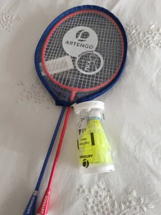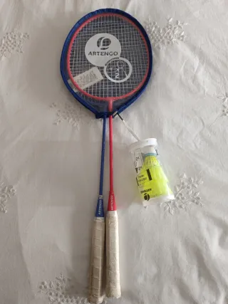 Set de dos raquetas de bádminton de la marca Artengo, para iniciacion o uso recreativo. Con funda protectora para las raquetas Contenido: Incluye dos raquetas (una roja y una azul) y un tubo con volantes (plumas). Las raquetas tienen encordado de fábrica y mangos encintados listos para usar.