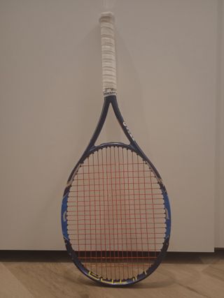 Raqueta de frontenis Boomerang de color azul. Solo hay que cambiarle el grip. - Marco de color azul. - Empuñadura con cinta desgastada.