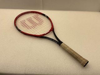 A cambiar la empuñadura con nuevo adhesivo. El resto perfecto. Raqueta de tenis con marco negro y detalles en rojo. .