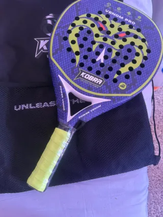 Raqueta de pádel Kobra Venom Pro, con un diseño llamativo inspirado en una serpiente. - Modelo: Venom Pro - Marca: Kobra - Grosor: 38 mm - Diseño: 3D Surface, 12K Carbon, Soft Black EVA, Tubular Carbon Frame - Frase: Unleash the Venom - Texto adicional: Power Venom