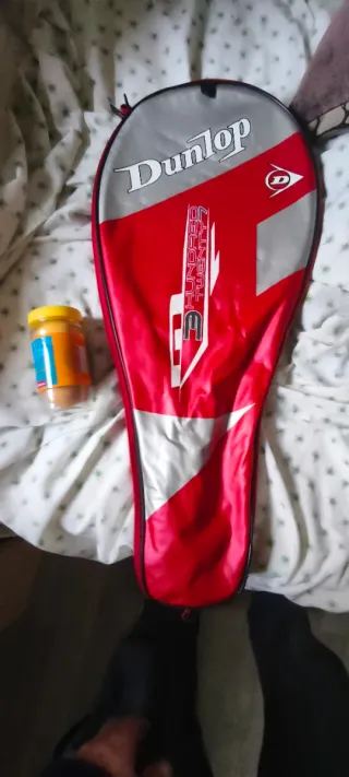 Raqueta de frontón con funda. Algo gastada, tiene algún rascón, pero está perfecta! Raqueta funda y 2 pelotas - Diseño en rojo y plateado. - Incluye funda protectora.