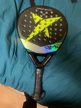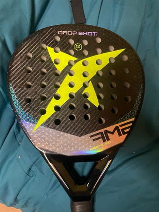 Raqueta de pádel Drop Shot con diseño moderno. - Superficie con acabado de carbono. - Detalles en color amarillo neón. - Logo de la marca visible.
