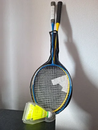 Set de dos raquetas de bádminton, perfectas para disfrutar del juego al aire libre. - Color azul. - Mangos con agarre en azul y rosa nuevos. - Se acompañan de funda. - Añadiría volante para poder jugar