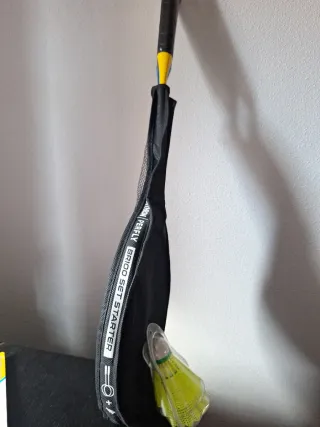 Raqueta de bádminton de color amarillo brillante, ideal para iniciarse en el deporte. El grip es blanco y está en perfecto estado. - Marco y varilla de color amarillo. - Grip blanco. - Marca: Artengo.