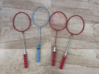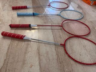 Conjunto de cuatro raquetas de bádminton. - Dos raquetas con aro rojo. - Una raqueta con aro azul. - Una raqueta con aro rojo y detalles blancos.