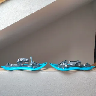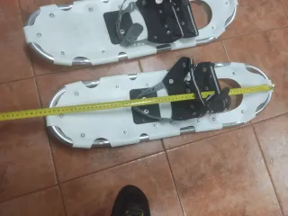Se han usado solo una vez, menos de 1 hora Datos técnicos: Modelo: unisex Adecuado para tallas de zapato: 38 - 46 Peso del usario (equipo incluido): hasta 140 kg Con auxiliar de escalada Peso de una raqueta: 1160 g Dimensiones: 72 x 22 cm