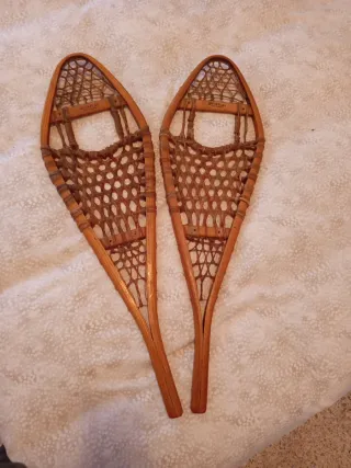 -Auténticas antiguas tradicionales raquetas de nieve canadienses. -Denominadas Pata de oso. -Fabricadas con madera de fresno y tripa de reno. -Medidas 76x32 cm -Muy buen estado.