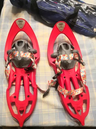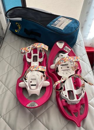 Raquetas de nieve para niños/adolescentes/mujeres de talla pequeña, ideales para iniciarse. Modelo técnico provisto de un reglaje muy simple de la talla, de dos correas de fijación con autoagarre y de un fuerte enganche gracias a su diseño 3D, sus 6 crampones y su uña delantera - válidas para tallas de calzado desde 30 a 40. - hasta 50kg de peso. - con bolsa de transporte. En buen estado. Muy pocos usos.