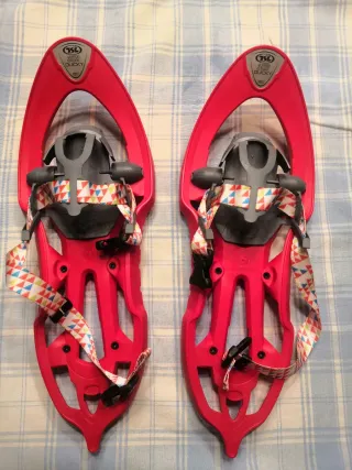 Par de raquetas de nieve TSL 302 Duicky en color rojo sin uso. - Modelo Duicky. -Muy ligeras - Aguanta hasta 50kg de peso -6 grampones antideslizantes Ideal para iniciarse en la marcha con raquetas - Correas con estampado geométrico.