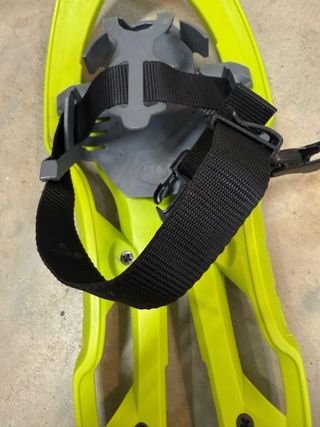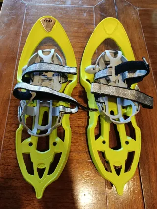 Raquetas de nieve marca TSL. diseñadas para niños y niñas. Son ligeras y fáciles de ajustar. En las fotos creo que se nota que están usadas dos o tres veces. Basta con ver cómo están las correas. - Color: Verde lima - Talla: Para niñ@s hasta 9/10años. - Cierre con correas