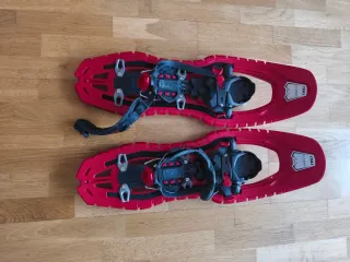 Par de raquetas de nieve TSL en color rojo. - Diseño ergonómico. - Sistema de fijación ajustable. - Ideales para senderismo invernal. Le falta la talonera izquierda.