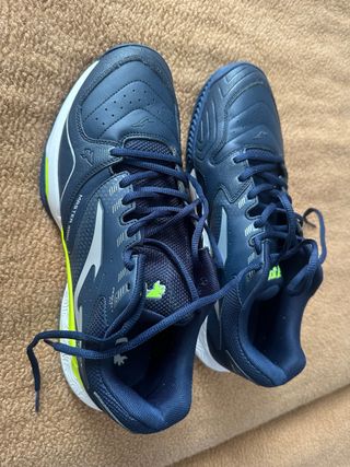 Zapatillas de pádel Joma en color azul marino, talla 45. Ideales para la pista.Solo quitada la etiqueta y probada la talla sobre la pista (me quedan justas).No tienen caja. - Diseño deportivo con detalles en verde lima y plateado. - Cierre de cordones. - Suela de goma de espiga. Las mejores para pádel. No leer: padel wilson adidas head galán lebron chingoto tapia coello red pista vibora bandeja asics