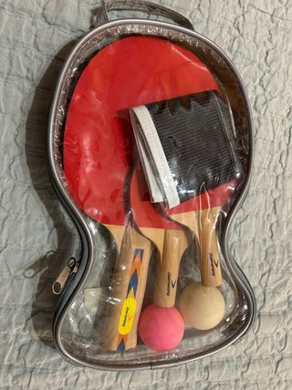 Juego de ping pong en buen estado, listo para disfrutar. Incluye dos raquetas con sus fundas, una red y varias bolas. Las raquetas presentan un diseño clásico y están en buenas condiciones. Ideal para principiantes o para jugar en casa. - 2 raquetas de ping pong con fundas azules. - 1 red de ping pong. - 3 bolas de ping pong.