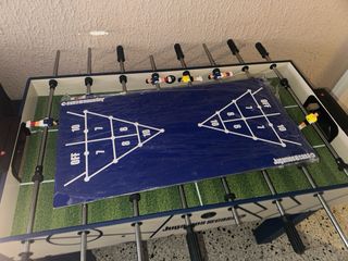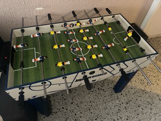 Divertido futbolín con diseño clásico y acabado en blanco y azul se convierte en mesa de billar levantando el futbolín y tiene mesa de ping-pong.Ideal para horas de entretenimiento. viene con las bolas del billar, palos, triángulo . La mesa de ping-pong incluye 2 palas , 2 pelotas y la red. - Campo de juego con césped artificial. - Figuras de jugadores en dos equipos. - Barras metálicas con mangos de agarre. PRECIO NEGOCIABLE