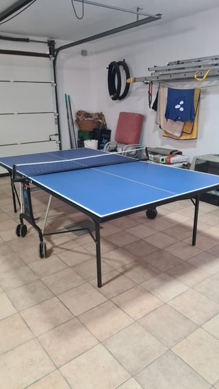 Mesa de ping pong de color azul, ideal para jugar en interiores o exteriores. - Superficie de juego azul. - Red incluida. - Patas plegables con ruedas para facilitar el transporte.
