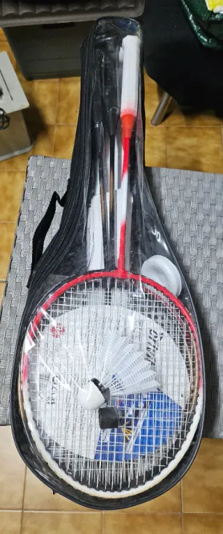 Set de bádminton con raquetas y accesorios. - Incluye dos raquetas de bádminton. - Se incluyen dos volantes (uno amarillo y otro blanco). - Viene con una funda protectora roja y negra.