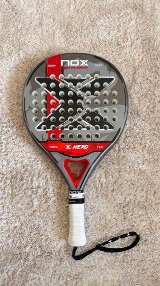 Pala de pádel NOX X-HERO en color rojo. Descubre la NOX X-Hero Red 2026, una pala llamativa y equilibrada que combina control, confort y durabilidad para jugadores principiantes e intermedios. - Incluye funda. - Modelo X-HERO. Usada solo en dos partidos.