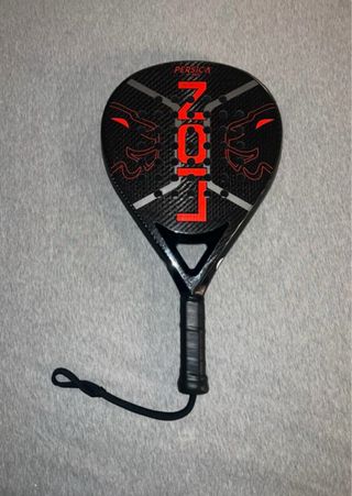 Pala de pádel Persica Pro Red 3K con diseño de león. - Acabado en carbono. - Detalles en color rojo. - Incluye cordón de seguridad.