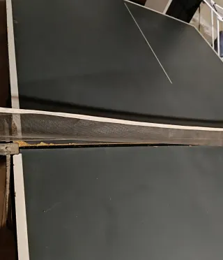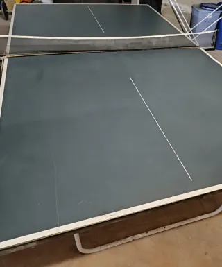 Mesa de ping pong de color verde oscuro con líneas blancas. Medidas: 1,08cm x 60cm ancho - Superficie de juego lisa. - Borde blanco. - Red de tenis de mesa incluida. - plegable y con 4 ruedas - para restaurar En decatlhon 399€, Si la quieres es tuya por tan solo 69€. Importante: Recogida en Domicilio (Tordera)