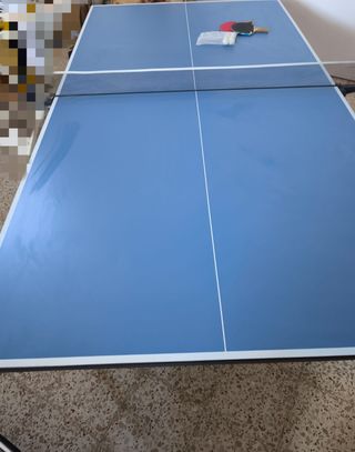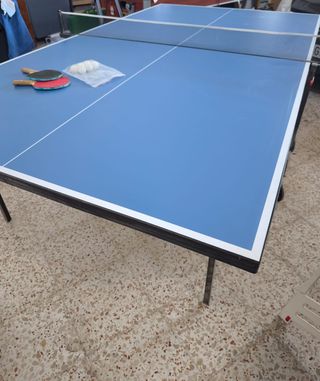 Mesa de ping pong de color azul, ideal para jugar en casa o en espacios recreativos. - Superficie de juego lisa. - Red de tenis de mesa incluida. - Patas plegables para un fácil almacenamiento.